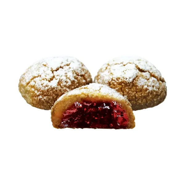 Mandelgebäck gefüllt mit schwarzer Kirschmarmeladenfüllung.