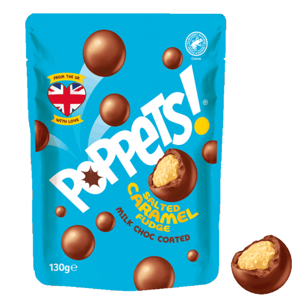 Die Poppets Salted Caramel Fudge sind kleine Schokokugeln mit einem zarten Fudgekern im beliebten Salted-Caramel-Geschmack, umhüllt von Vollmilchschokolade. Die Kombination aus süßem Karamell, feiner Salznote und cremiger Schokolade sorgt für ein ausgewogenes Geschmacksprofil und positioniert das Produkt im Segment moderner Schokoladensnacks. In der Verpackung mit 130 g eignen sich die Poppets ideal für den Impulsverkauf und bieten eine attraktive Ergänzung im Süßwarenregal.