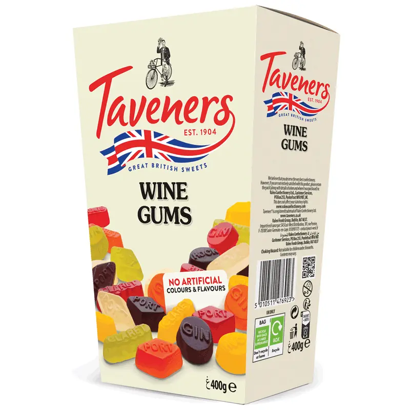 Echtes englisches Weingummi aus Großbritannien.Präsentiert in einer Geschenkverpackung. Die unterschiedlichen Formen und Farben der Gummibonbons haben verschiedene, herrlich aromatisierte Geschmacksrichtungen.