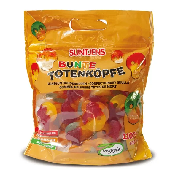 Die bunten Totenköpfe sind Fruchtgummibonbons in markanter Totenkopfform mit fruchtigem Geschmack und transparenter, mehrfarbiger Optik. Das Produkt wird im modernen Standbodenbeutel (Doypack) angeboten, der durch seine Wiederverschließbarkeit und den integrierten Griff eine komfortable Handhabung sowie flexible Platzierungsmöglichkeiten im Verkaufsraum bietet. Dank gelatinefreier Rezeptur sowie der Verwendung natürlicher Farb- und Aromastoffe eignet sich der Artikel für eine breite Zielgruppe und unterstützt eine dynamische Nachfrage im Fruchtgummi-Segment.