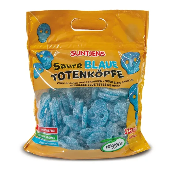 Die sauren blauen Totenköpfe sind saure Fruchtgummibonbons in prägnanter Totenkopfform mit intensivem Geschmack und zungenfärbender Eigenschaft. Als Neuheit im funktionalen Doypack bietet der wiederverschließbare Standbodenbeutel mit integriertem Griff eine praktische Handhabung sowie flexible Platzierungsmöglichkeiten im Verkaufsraum. Hergestellt ohne Gelatine und mit natürlichen Aromen, spricht der Artikel eine breite Zielgruppe an und unterstützt den Impulsverkauf.
