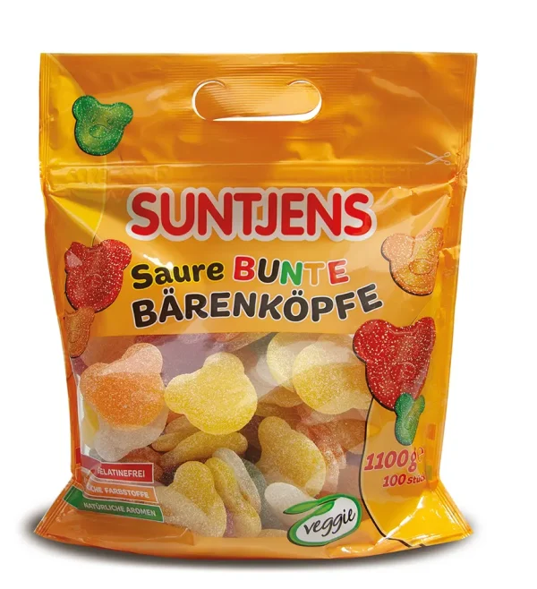 Die sauren bunten Bärenköpfe sind saure Fruchtgummibonbons in Bärenkopfform mit fruchtigem Geschmack und mehrfarbiger Optik. Die Kombination aus saurer Ummantelung und weicher Konsistenz sorgt für ein ausgewogenes Geschmacksprofil und unterstützt eine aufmerksamkeitsstarke Präsentation im Regal. Verpackt im wiederverschließbaren Doypack, bietet der Artikel eine praktische Handhabung und flexible Platzierungsmöglichkeiten im Impulsverkauf.